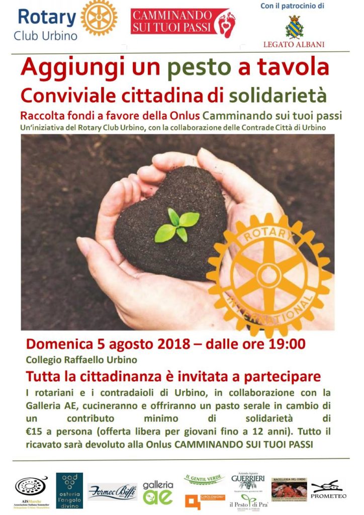 Cena con raccolta fondi a favore dell’Onlus Camminando sui tuoi Passi, un’iniziativa a cura del Rotary Club di urbino in collaborazione con le Contrade Città di Urbino